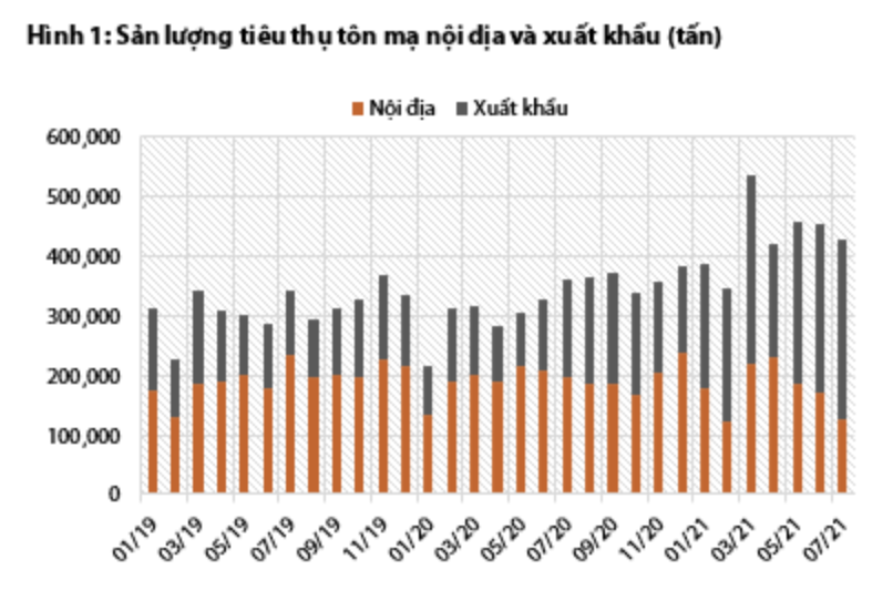 Sản lượng xuất khẩu của các công ty tôn mạ Việt Nam đạt 300.000 tấn trong tháng 7, tăng 6% so với tháng 6. Trong khi đó, các biện pháp kiểm soát dịch ở miền Nam và một số thành phố lớn đã ảnh hưởng tiêu cực đến nhu cầu tiêu thụ trong nước khi sản lượng tiêu thụ giảm xuống còn 127.700 tấn trong tháng 7, giảm 35% so với cùng kỳ. Tổng sản lượng tiêu thụ tôn mạ đạt khoảng 430.000 tấn trong tháng 7, giảm nhẹ nhưng vẫn ở mức cao.