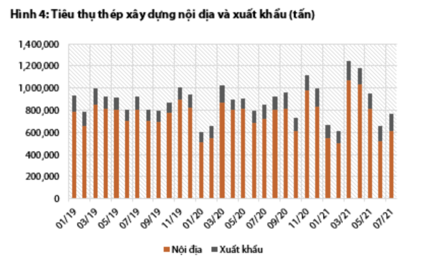 Tiêu thụ thép xây dựng đạt khoảng 770.000 tấn trong tháng 7, giảm 10% so với cùng kỳ. Tiêu thụ ống thép thậm chí còn giảm mạnh hơn còn 143.500 tấn, giảm 41%. Do diễn biến dịch phức tạp, các biện pháp phòng dịch tiếp tục kéo dài trong tháng 8, khiến tiêu thụ thép xây dựng và ống thép vẫn ở mức thấp. Biên lợi nhuận gộp mảng thép xây dựng chịu áp lực giảm trong quý 3.